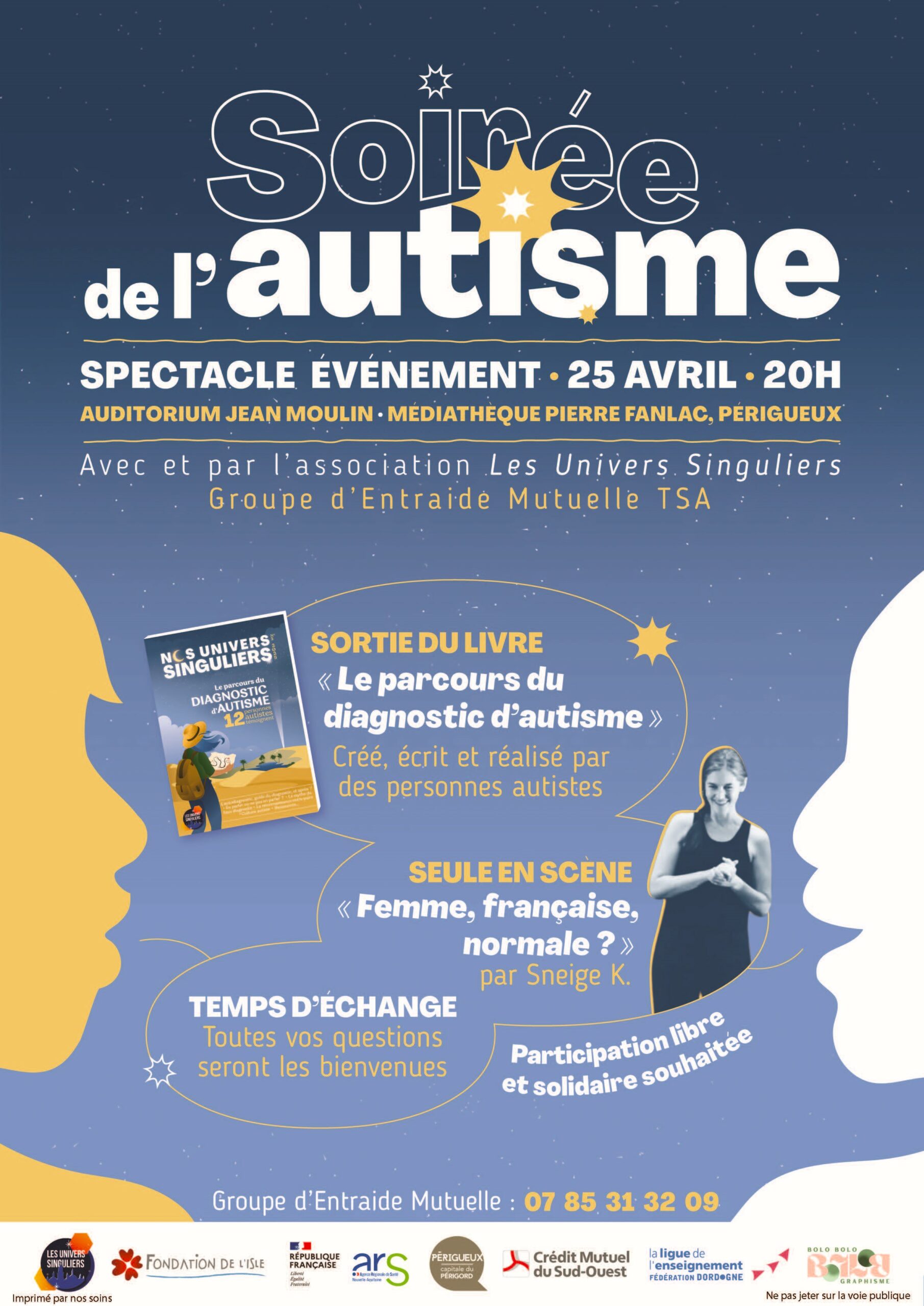 créé, écrit et réalisé par des personnes autistes (et mis en page par mes soins), contenant des témoignages, articles, conseils et documentations autour d’un diagnostic difficile d’accès. Il sera disponible sur place à prix libre, ainsi que le tome précédent de Nos Univers Singuliers « La partie immergée de l’autisme ».